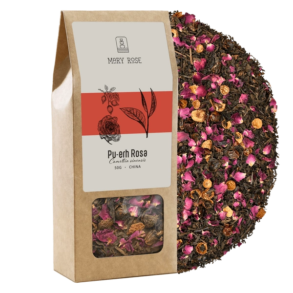 Mary Rose Το Pu-erh Rosa είναι ένας αισθησιακός συνδυασμός τσαγιού puerh και προσθέτων τριαντάφυλλου - τριανταφυλλιά και πέταλα τριαντάφυλλου. Ένα λεπτό, δελεαστικό άρωμα, που θυμίζει ένα μπουκέτο όμορφων τριαντάφυλλων, αναδύεται από τη συσκευασία του τσαγιού όταν ανοίγει για πρώτη φορά. Το ευχάριστο άρωμα παραμένει πολύ καιρό μετά την παρασκευή του τσαγιού.