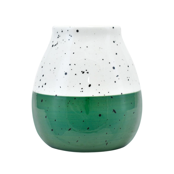 Κεραμική καλαμπάσα "Papagayo " - μια βολική, συμπαγής κολοκύθα yerba mate με χωρητικότητα περίπου 300-350ml. Το σχήμα της κολοκύθας είναι εμπνευσμένο από τις παραδοσιακές καλαμπάσες της Νότιας Αμερικής. Γυαλισμένο εσωτερικά και εξωτερικά. Καλυμμένη με ελαφρύ γλάσο και διακοσμημένη με μαύρα, ακανόνιστα στικτά μοτίβα. Διαθέτει ένα κομψό κόψιμο στο κάτω μέρος σε πράσινο χρώμα. Η σχεδιαστική κολοκύθα yerba mate θα συμπληρώσει τέλεια τον εξοπλισμό κάθε mateist!