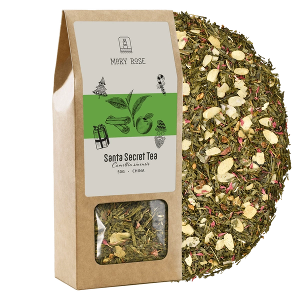 Mary Rose Το Santa Secret είναι ένα μοναδικό τσάι σε χριστουγεννιάτικο κλίμα! Το πράσινο τσάι sencha, με ξεχωριστή και έντονη γεύση, συνδυάζεται σε μια πρωτότυπη σύνθεση με γευστικά πρόσθετα: ζουμερό μήλο, νιφάδες γλυκού αμυγδάλου, κανέλα και φυσικό γαρυφαλέλαιο. Οπτικά, το μείγμα συμπληρώνεται από κόκκινα πέταλα καλαμποκιού. Οι πικάντικες προσθήκες ζεσταίνουν ευχάριστα και θυμίζουν τη γεύση των μπισκότων μελόψωμου που ψήνονται τα Χριστούγεννα. Νόστιμο!