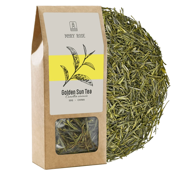 Mary Rose Το Golden Sun είναι ένα κίτρινο τσάι της ποικιλίας "Yellow Buds", που προέρχεται από την επαρχία Anhui της Κίνας. Είναι μία από τις σπανιότερες ποικιλίες μεταξύ όλων των τσαγιών. Ονομάζεται επίσης "τσάι του αυτοκράτορα", το οποίο αναφέρεται σε ορισμένους κινεζικούς θρύλους. Λέγεται ότι αιώνες πριν, κατά τη διάρκεια της κινεζικής δυναστείας Qing, το κίτρινο τσάι ήταν αποκλειστικά για τον αυτοκράτορα και όποιος τολμούσε να το δοκιμάσει καταδικαζόταν σε θάνατο. Το κίτρινο τσάι είναι εξαιρετικά ευχάριστο σε γεύση και άρωμα. Το έγχυμα έχει ανοιχτό κίτρινο-πράσινο χρώμα. Υπάρχουν γλυκές νότες στο άρωμα και η γεύση είναι ελαφρώς χορταριασμένη στην αρχή, για να εξελιχθεί σε μια επίγευση ώριμου αχλαδιού.