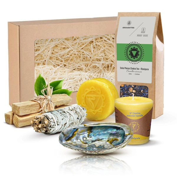 Σετ δώρου για το τσάκρα του ηλιακού πλέγματος (Manipura): τσάι τσάκρα + θυμίαμα + κερί