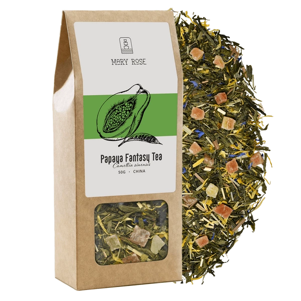 - Mary Rose Το Papaya Fantasy είναι ένα μείγμα με βάση το πράσινο τσάι sencha και τέλεια επιλεγμένα βότανα και πρόσθετα φρούτων. Η ζαχαρωμένη παπάγια ξεχωρίζει εδώ ιδιαίτερα, καθώς εισάγει μια αρωματική νότα γλυκύτητας στη σύνθεση.