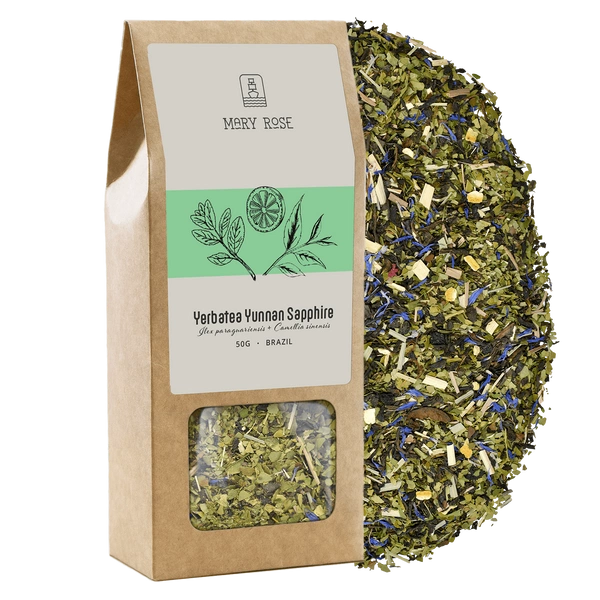 Mary Rose ΤοYunnan Sapphire yerbatea συνδυάζει το βραζιλιάνικο πράσινο yerba mate με την έντονη γεύση του μαύρου τσαγιού yunnan. Τα ομοιόμορφα, χοντροκομμένα κομμάτια των φύλλων Ilex paraguariensis σχηματίζουν μια εκπληκτικά αισθητικά συνεκτική σύνθεση με φύλλα μαύρου τσαγιού και πέταλα καλαμποκιού ζαφειριού. Τα πρόσθετα όπως αποξηραμένοι καρποί chokeberry, φλούδα λεμονιού και λεμονόχορτο είναι υπεύθυνα για τη μοναδική γεύση αυτού του μείγματος. Ο συνδυασμός yerba mate και τσαγιού έχει ελαφρώς ασθενέστερη διεγερτική δράση από το "κανονικό" yerba mate. Επομένως, το Yerbatea είναι ιδανικό για αρχάριους λάτρεις του αφεψήματος που δεν είναι ακόμη εξοικειωμένοι με τη διεγερτική δύναμη του yerba mate.